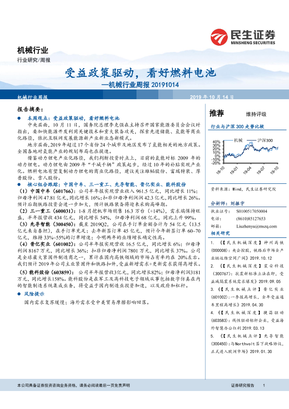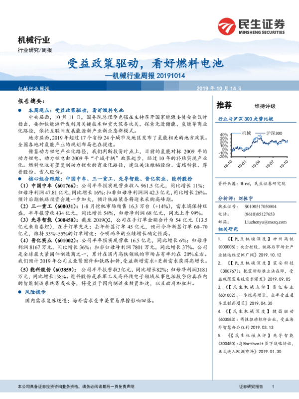 【民生证券】【20191014】20191014-民生证券-机械行业周报:受益政策驱动,看好燃料电池-17页