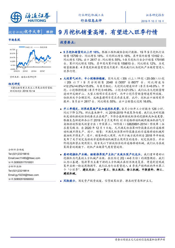 【海通证券】【20191015】机械工业行业信息点评:9月挖机销量高增,有望进入旺季行情-4页