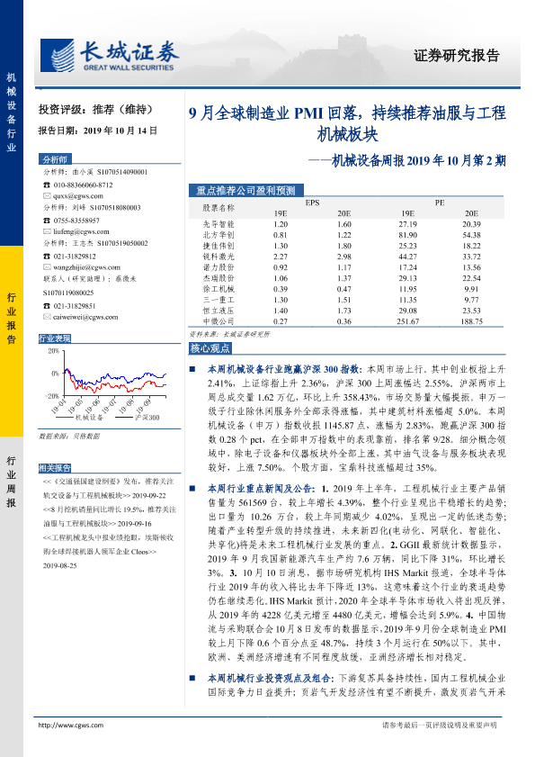 【长城证券】【20191014】机械设备周报2019年10月第2期:9月全球制造业PMI回落,持续推荐油服与工程机械板块-11页
