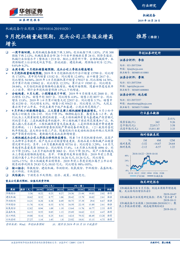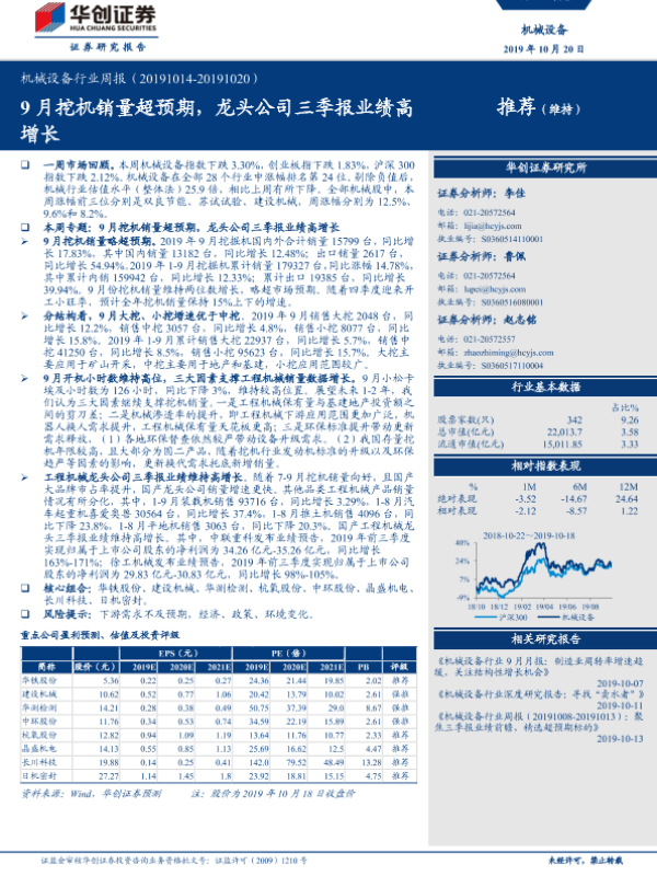 【华创证券】【20191020】20191020-华创证券-机械设备行业周报:9月挖机销量超预期,龙头公司三季报业绩高增长-19页