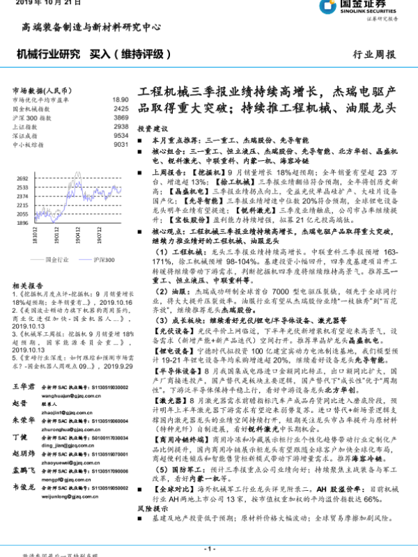 【国金证券】【20191021】20191021-国金证券-机械行业周报:工程机械三季报业绩持续高增长,杰瑞电驱产品取得重大突破;持续推工程机械、油服龙头-23页