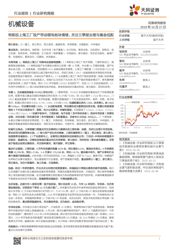 【天风证券】【20191027】20191027-天风证券-机械设备行业研究周报:特斯拉上海工厂投产带动锂电板块情绪,关注三季报业绩与基金低配-23页
