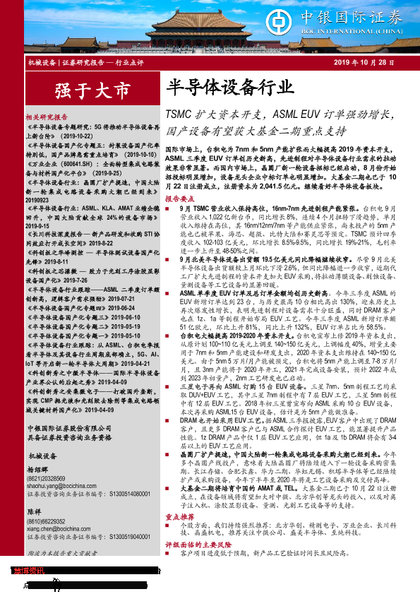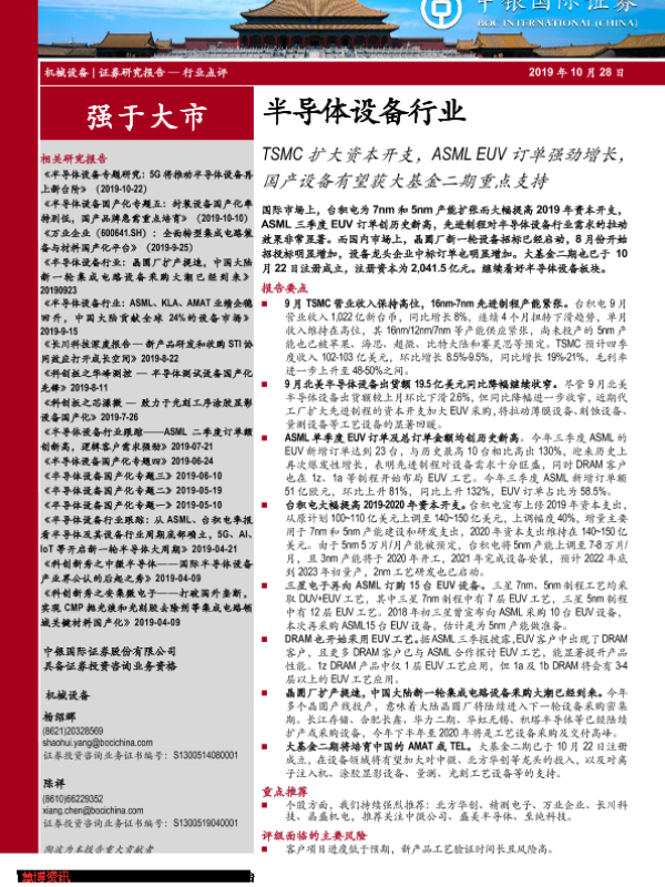 【中银证券】【20191028】半导体设备行业:TSMC扩大资本开支,ASML EUV订单强劲增长,国产设备有望获大基金二期重点支持-9页