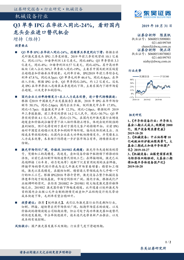 【东吴证券】【20191031】机械设备行业:Q3单季IPG在华收入同比-24%,看好国内龙头企业进口替代机会-2页