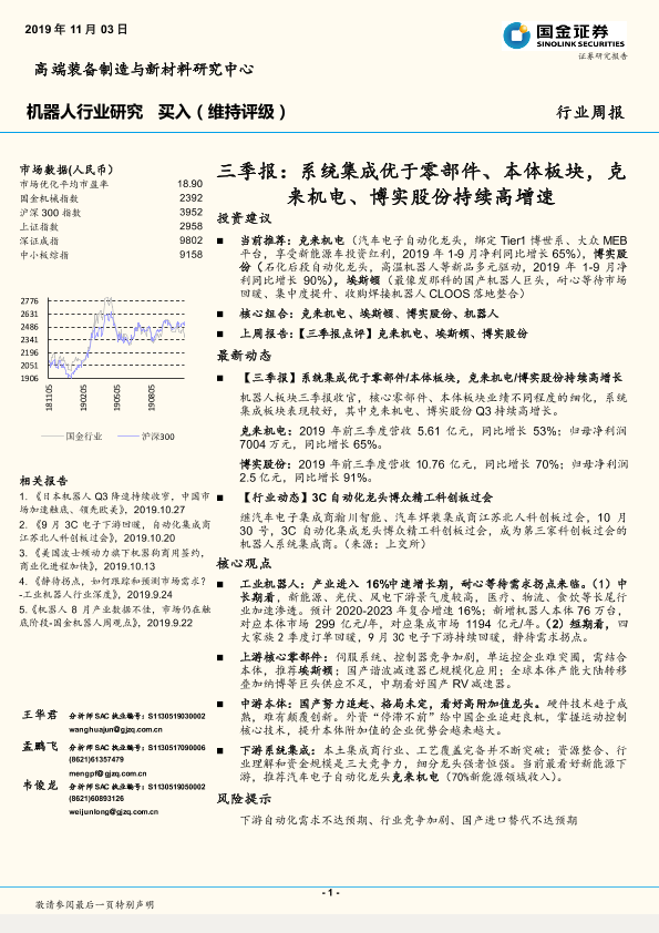 【国金证券】【20191103】20191103-国金证券-机器人行业研究三季报:系统集成优于零部件、本体板块,克来机电、博实股份持续高增速-14页