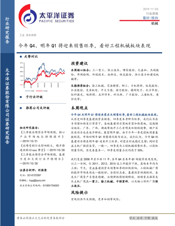 【太平洋证券】【20191103】20191103-太平洋-机械行业周报:今年Q4、明年Q1将迎来销售旺季,看好工程机械板块表现-13页