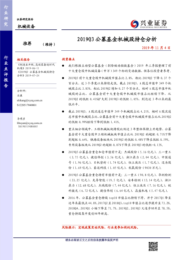 【兴业证券】【20191104】2019Q3公募基金机械股持仓分析-11页