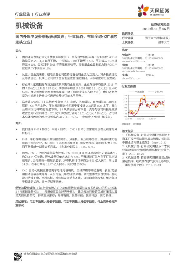 【天风证券】【20191106】20191106-天风证券-机械设备行业点评:国内外锂电设备季报表现复盘:行业低谷,布局全球化扩张的龙头企业!-14页