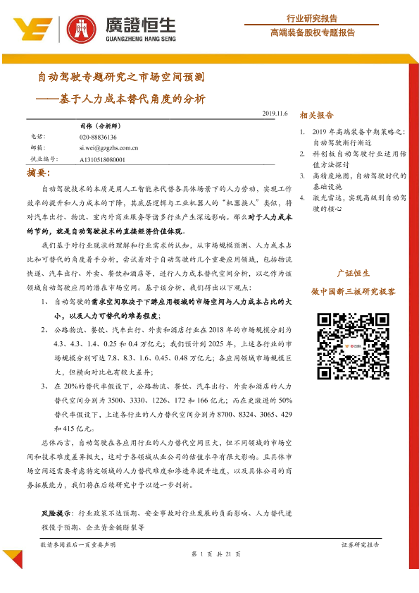 【广证恒生】【20191106】自动驾驶专题研究之市场空间预测:基于人力成本替代角度的分析-21页