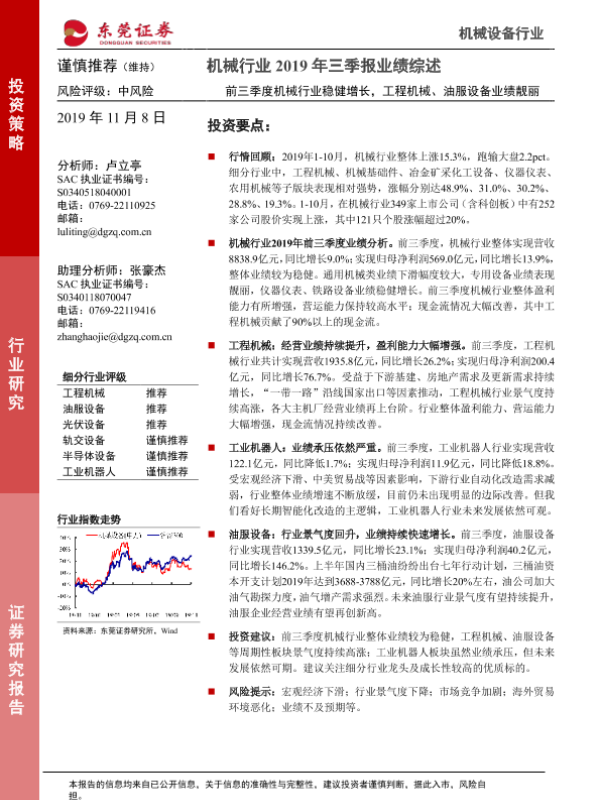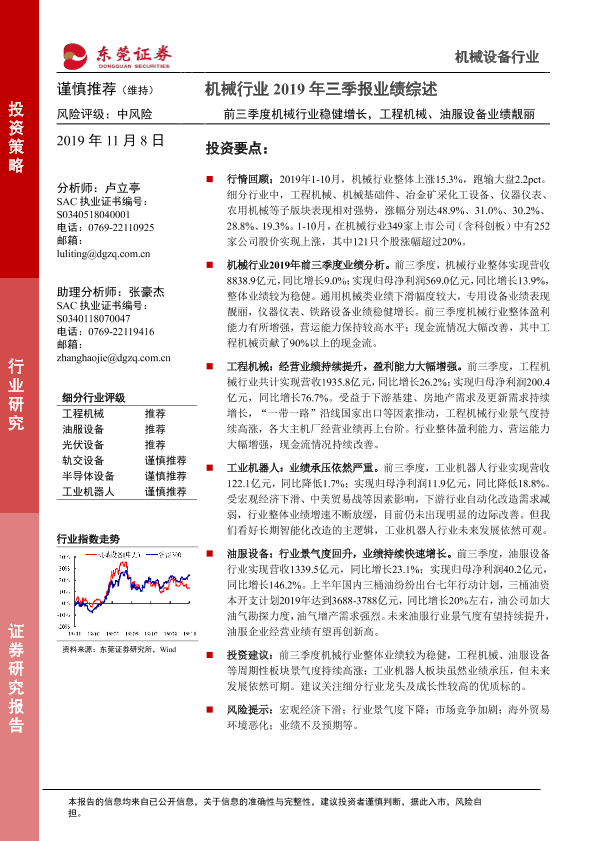 【东莞证券】【20191108】机械行业2019年三季报业绩综述:前三季度机械行业稳健增长,工程机械、油服设备业绩靓丽-17页