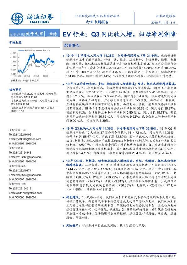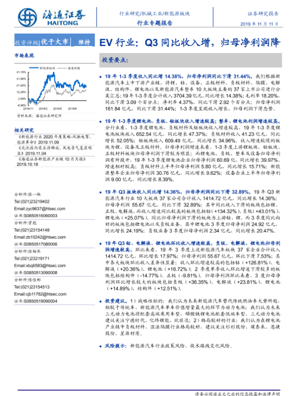【海通证券】【20191111】EV行业:Q3同比收入增,归母净利润降-20页