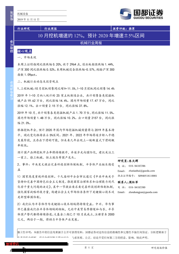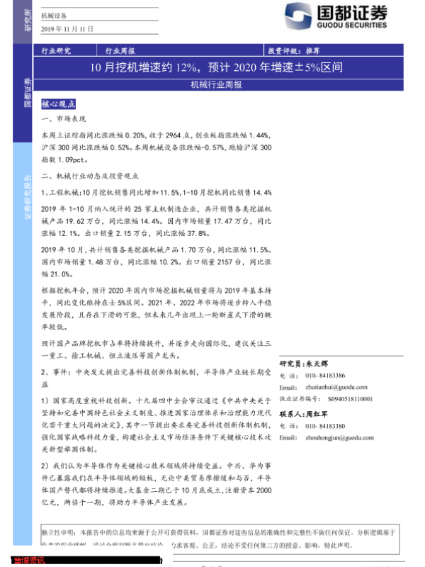 【国都证券】【20191111】机械行业周报:10月挖机增速约12%,预计2020年增速±5%区间-3页