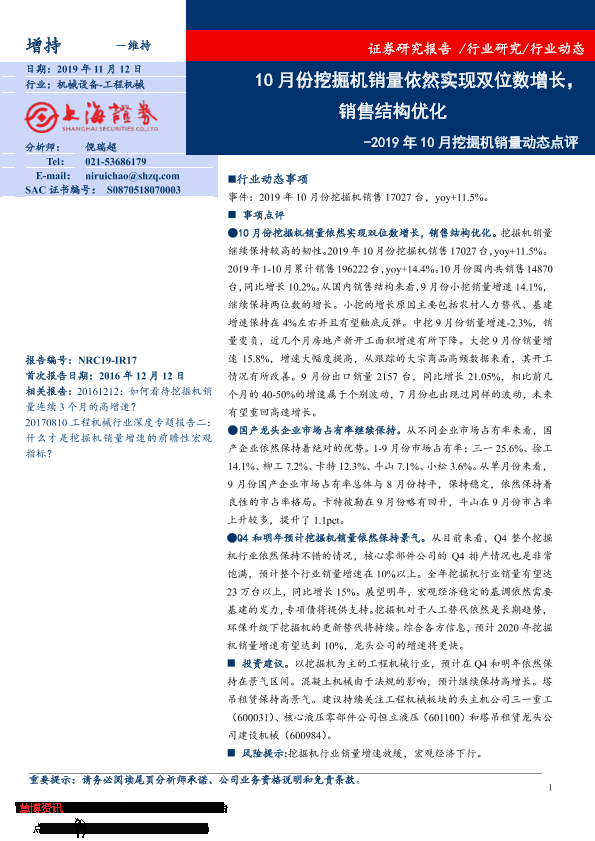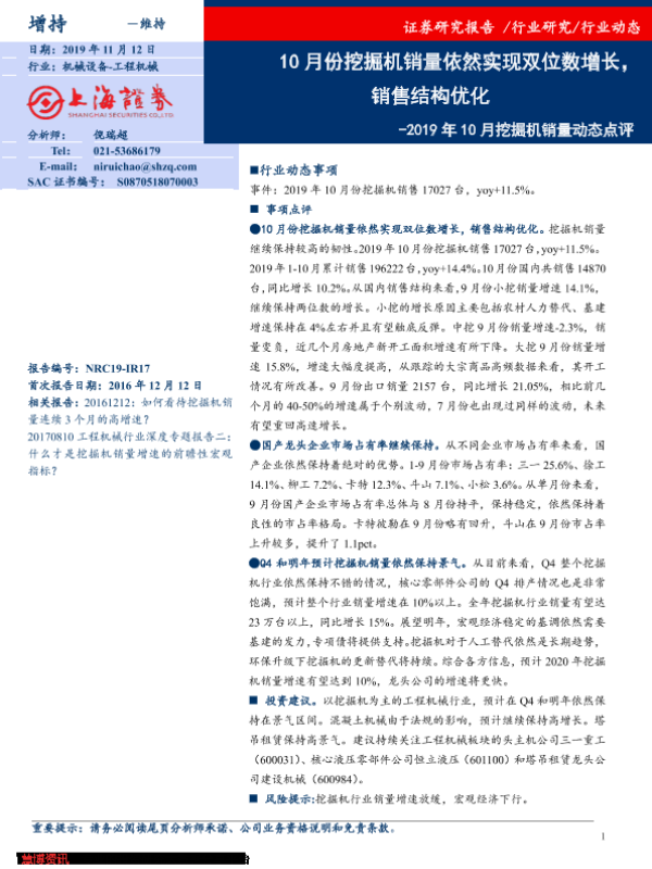 【上海证券】【20191112】2019年10月挖掘机销量动态点评:10月份挖掘机销量依然实现双位数增长,销售结构优化-2页