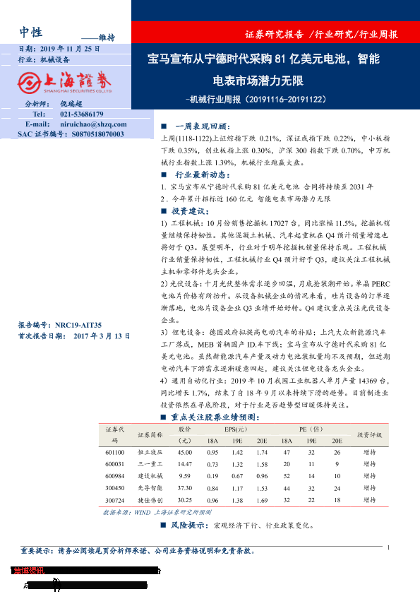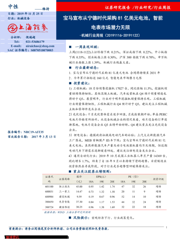 【上海证券】【20191125】20191125-上海证券-机械行业周报:宝马宣布从宁德时代采购81亿美元电池,智能电表市场潜力无限-5页