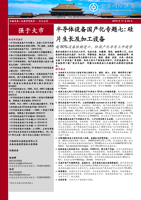 【中银证券】【20191124】半导体设备国产化专题七:硅片生长及加工设备-超80%设备依赖进口,但国产化率有上升趋势-19页