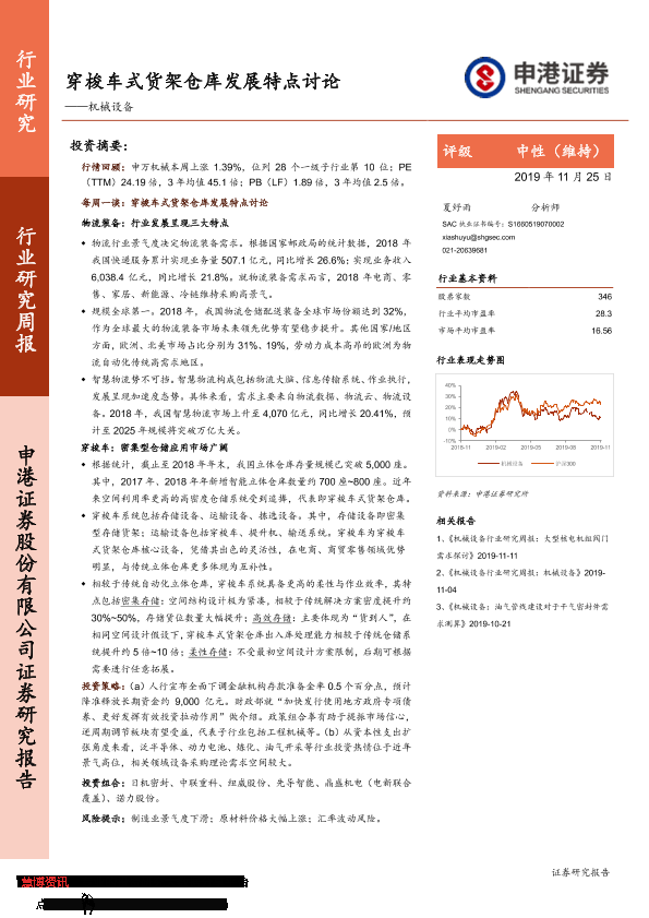 【申港证券】【20191125】20191125-申港证券-机械设备行业研究周报:穿梭车式货架仓库发展特点讨论-17页