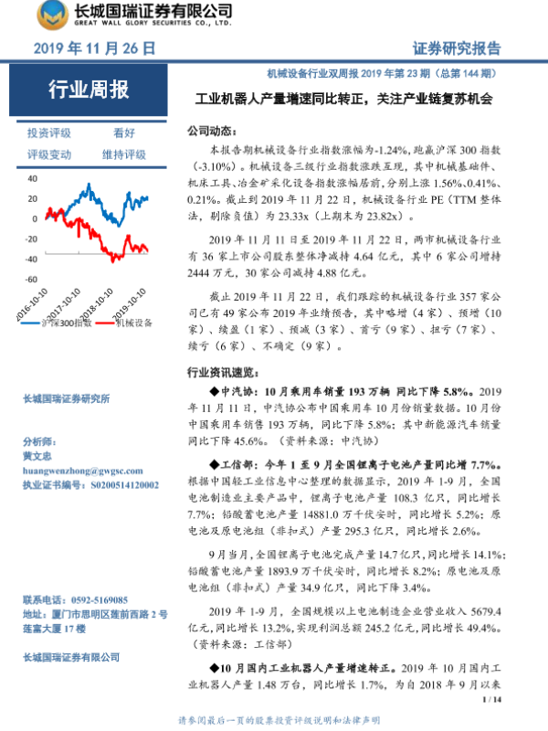 【长城国瑞证券】【20191126】机械设备行业双周报2019年第23期(总第144期):工业机器人产量增速同比转正,关注产业链复苏机会-14页