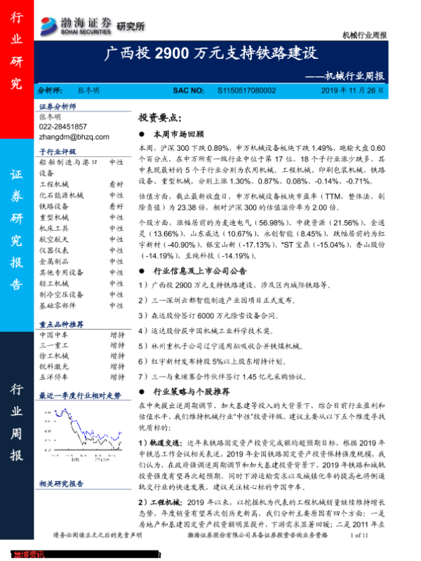 【渤海证券】【20191126】机械行业周报:广西投2900万元支持铁路建设-11页