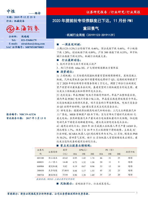 【上海证券】【20191202】20191125-上海证券-机械行业周报:2020年提前批专项债额度已下达,11月份PMI重回景气-5页