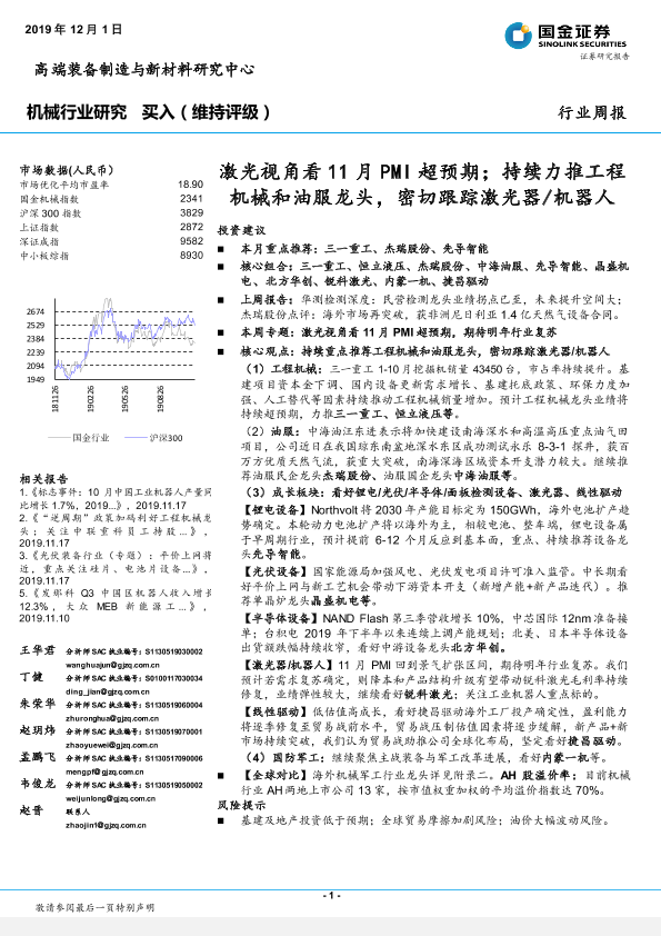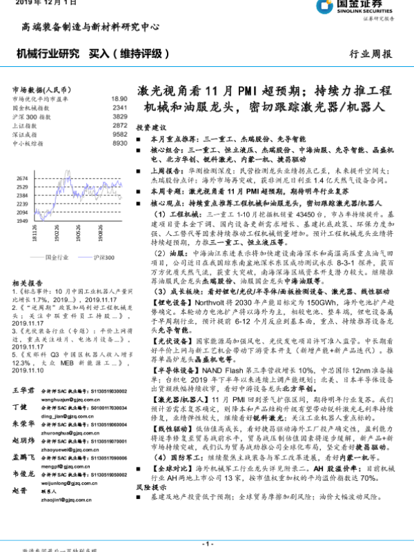 【国金证券】【20191201】20191201-国金证券-机械行业研究:激光视角看11月PMI超预期;持续力推工程机械和油服龙头,密切跟踪激光器 机器人-23页