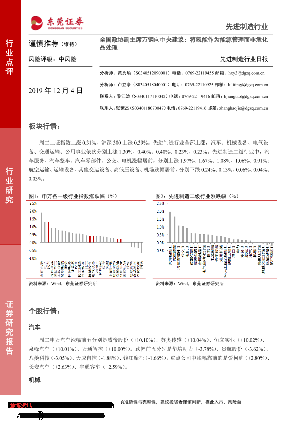 【东莞证券】【20191204】20191204-东莞证券-先进制造行业日报:全国政协副主席万钢向中央建议:将氢能作为能源管理而非危化品处理-5页