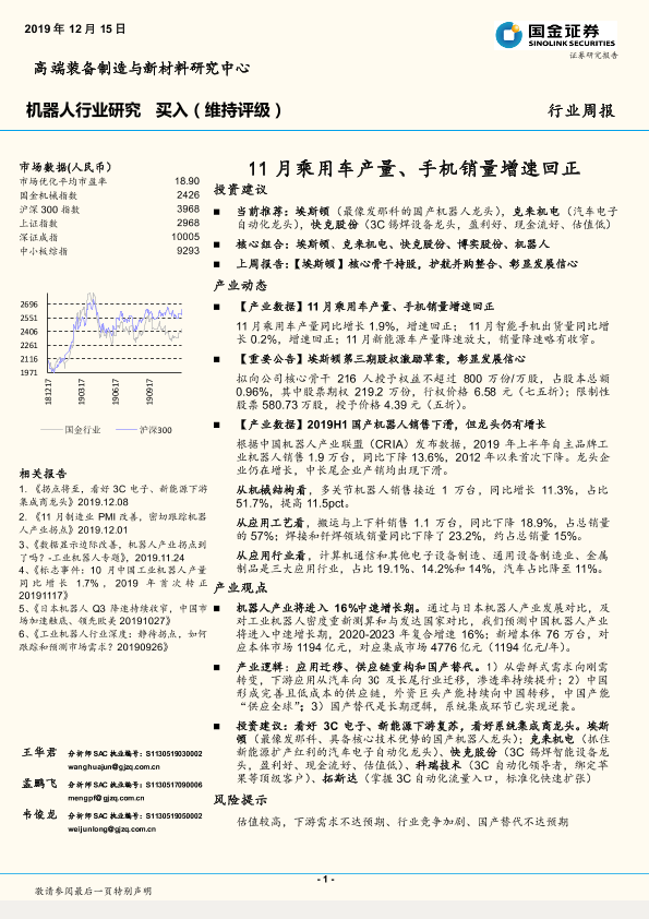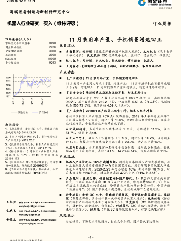 【国金证券】【20191215】20191215-国金证券-机器人行业研究周报:11月乘用车产量、手机销量增速回正-15页