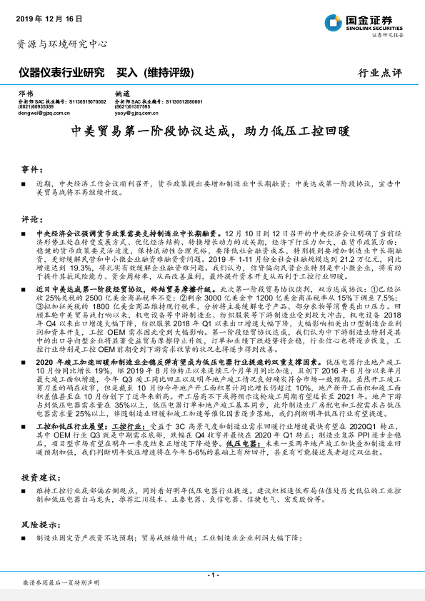 【国金证券】【20191216】仪器仪表行业研究:中美贸易第一阶段协议达成,助力低压工控回暖-6页