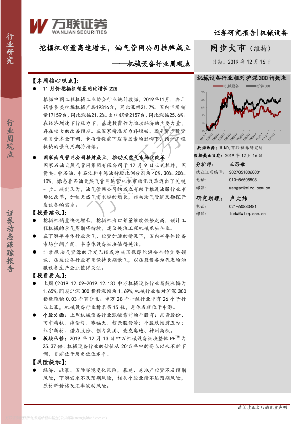 【万联证券】【20191216】20191216-万联证券-机械设备行业周观点:挖掘机销量高速增长,油气管网公司挂牌成立-10页