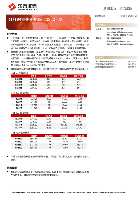 分红预测 投资分析 股指期货 风险提示 金融工程