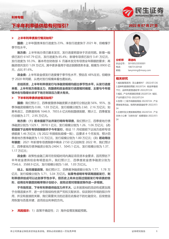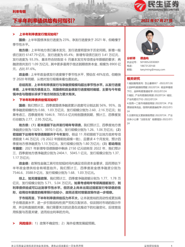 【民生证券】【20220727】利率专题:下半年利率债供给有何指引?-20页