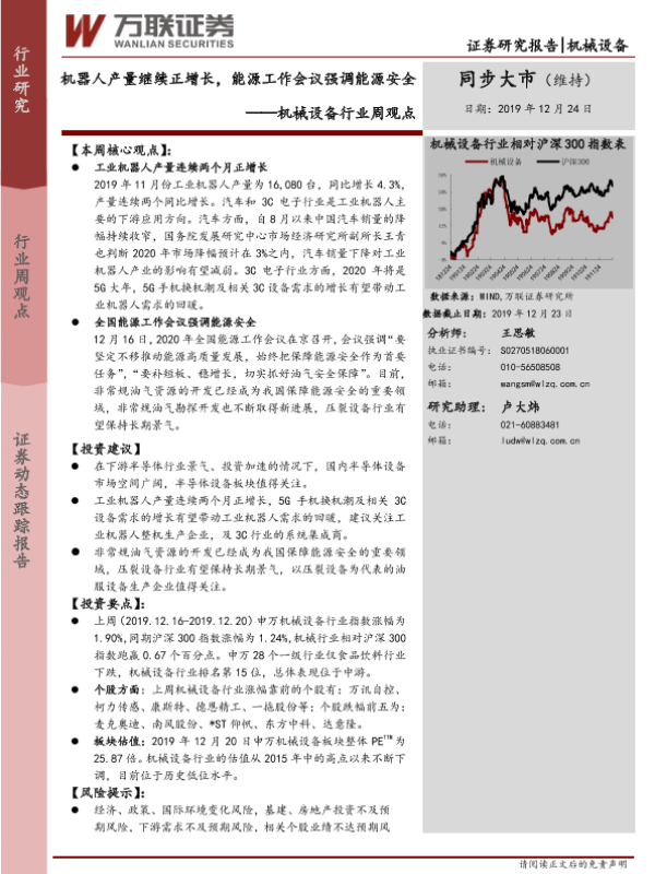 【万联证券】【20191224】机械设备行业周观点:机器人产量继续正增长,能源工作会议强调能源安全-9页
