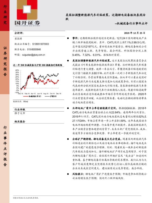 【国开证券】【20191225】美国拟调整新能源汽车补贴政策,近期锂电设备板块表现活跃--机械设备行业事件点评-4页