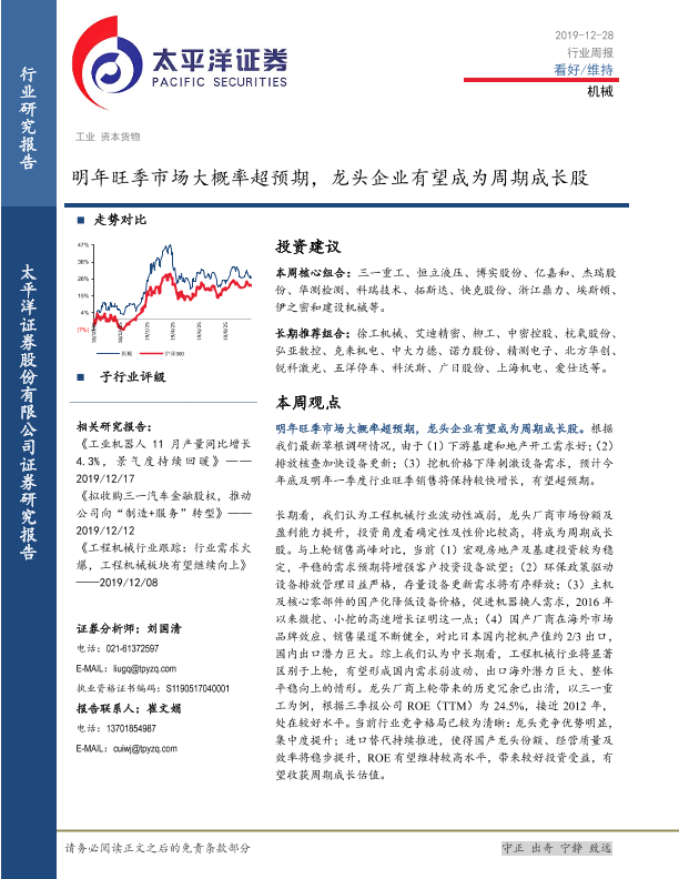 【太平洋证券】【20191228】20191228-太平洋-机械行业周报:明年旺季市场大概率超预期,龙头企业有望成为周期成长股-13页