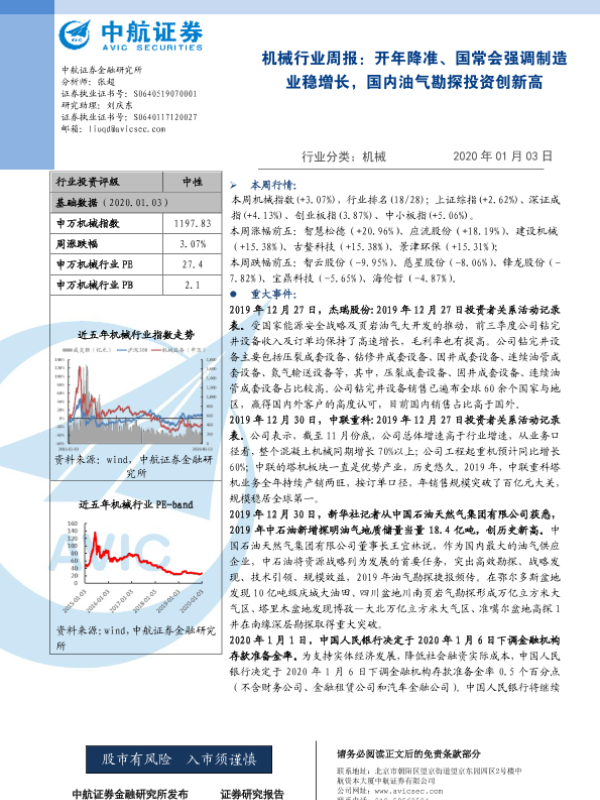 【中航证券】【20200103】机械行业周报:开年降准、国常会强调制造业稳增长,国内油气勘探投资创新高-5页