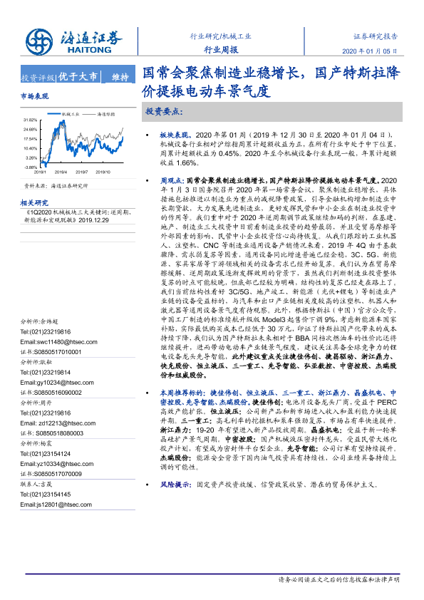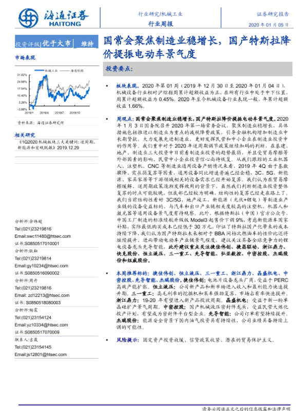 【海通证券】【20200105】机械工业行业周报:国常会聚焦制造业稳增长,国产特斯拉降价提振电动车景气度-11页