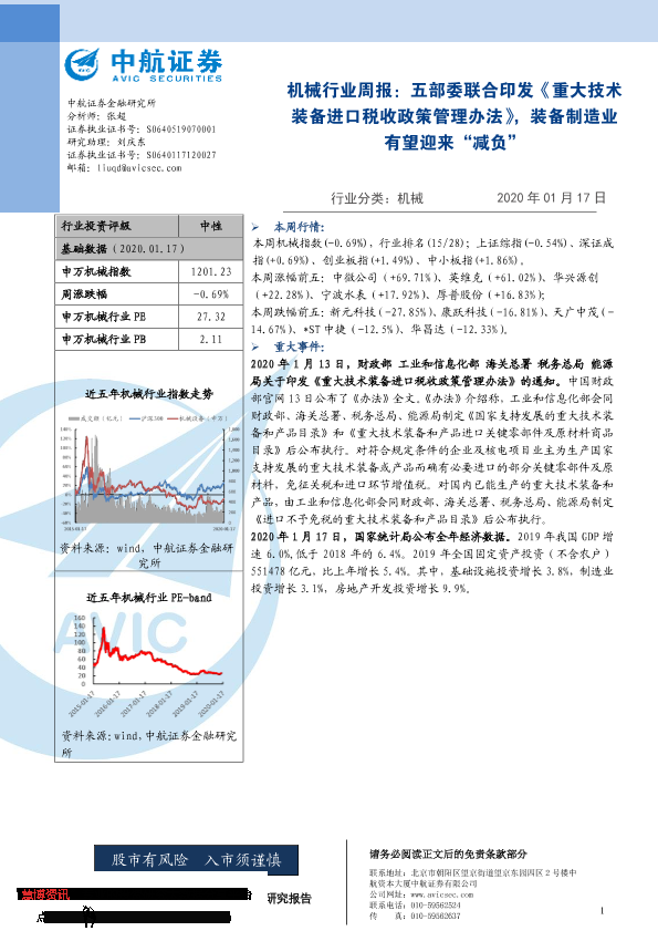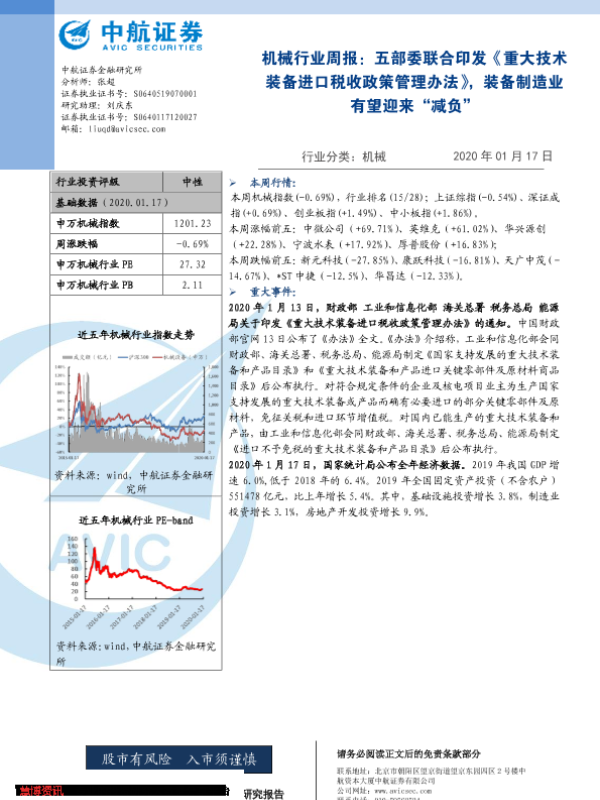 【中航证券】【20200117】机械行业周报:五部委联合印发《重大技术装备进口税收政策管理办法》,装备制造业有望迎来“减负”-6页