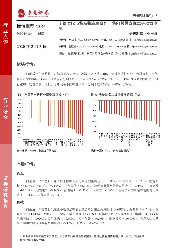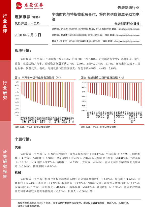 【东莞证券】【20200203】先进制造行业日报:宁德时代与特斯拉业务合作,将向其供应锂离子动力电池-4页