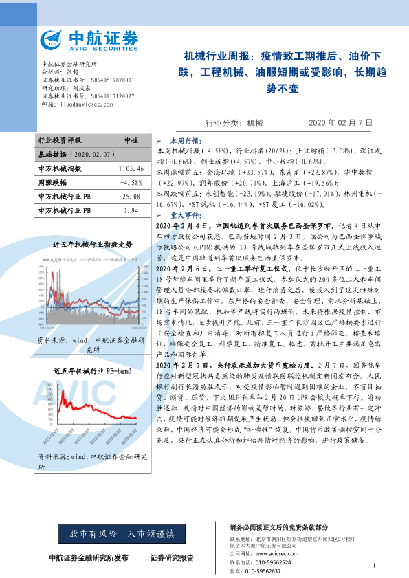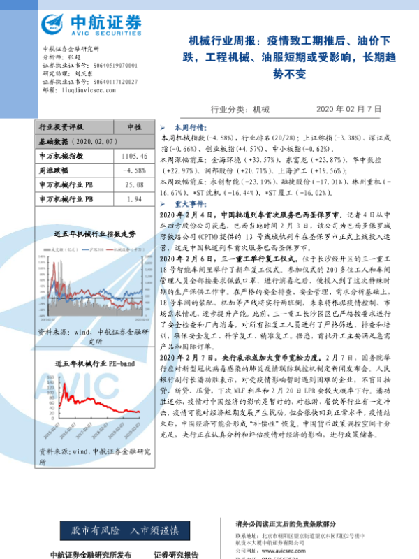 【中航证券】【20200207】20200207-中航证券-机械行业周报:疫情致工期推后、油价下跌,工程机械、油服短期或受影响,长期趋势不变-9页