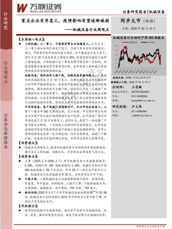 【万联证券】【20200210】机械设备行业周观点:重点企业有序复工,疫情影响有望逐渐减弱-8页