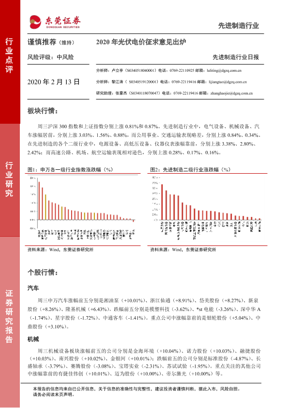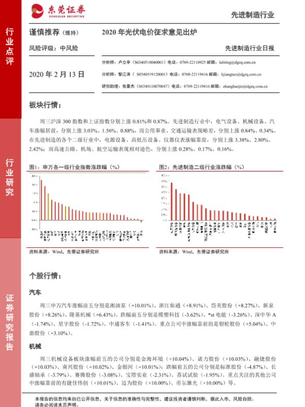 先进制造 光伏电价 机械设备 汽车行业 电气设备