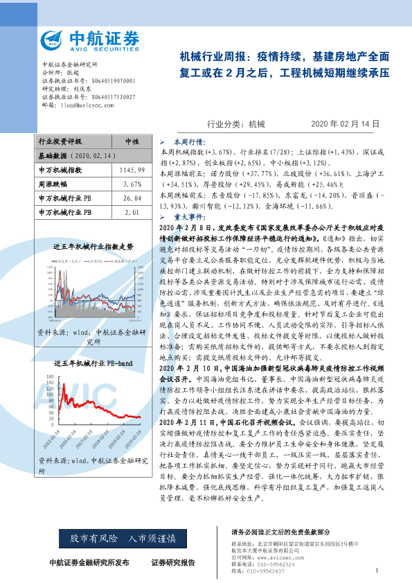 【中航证券】【20200214】20200214-中航证券-机械行业周报:疫情持续,基建房地产全面复工或在2月之后,工程机械短期继续承压-12页