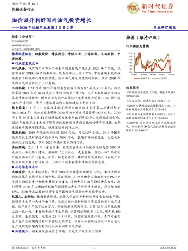 【新时代证券】【20200216】2020年机械行业周报2月第2期:油价回升利好国内油气投资增长-11页