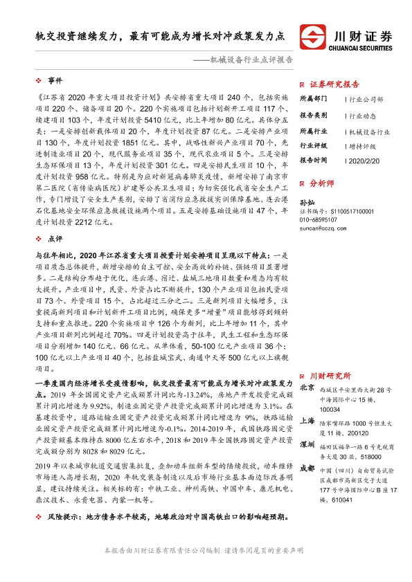 【川财证券】【20200220】机械设备行业点评报告:轨交投资继续发力,最有可能成为增长对冲政策发力点-2页