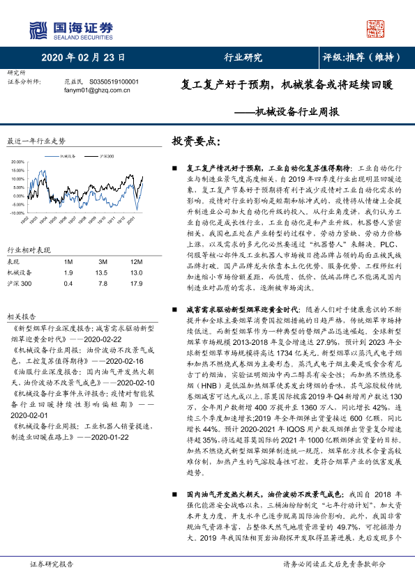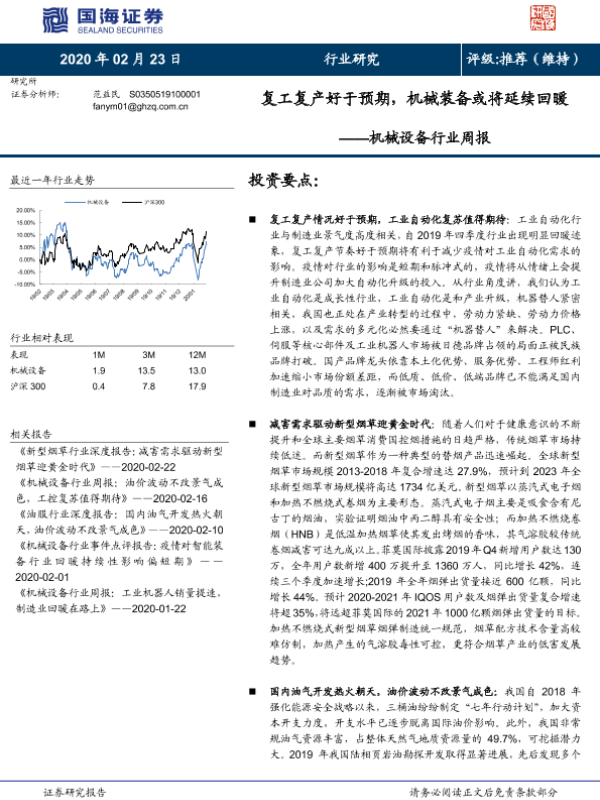 【国海证券】【20200223】机械设备行业周报:复工复产好于预期,机械装备或将延续回暖-17页