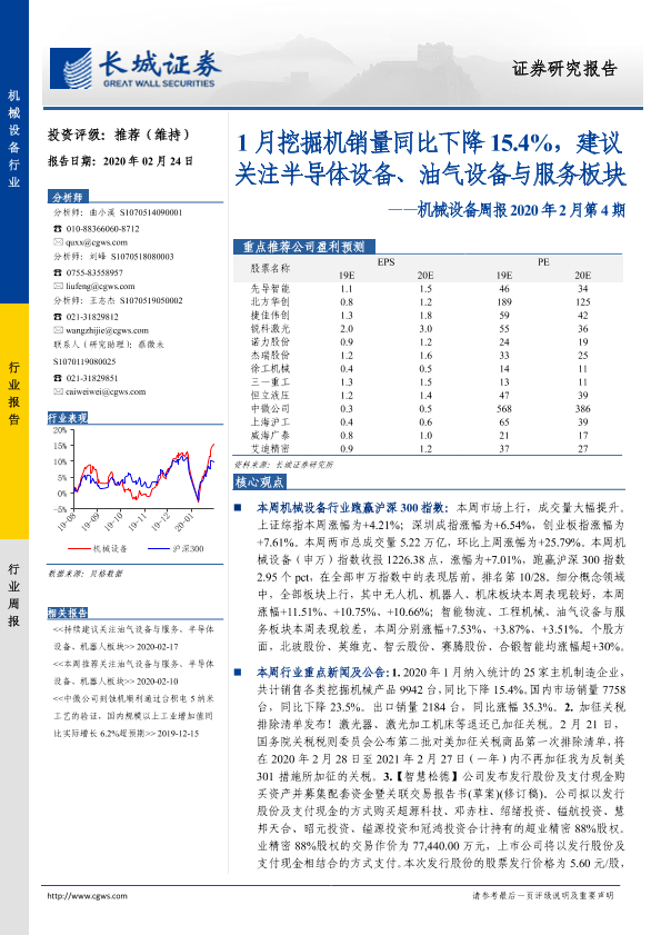 【长城证券】【20200224】机械设备周报2020年2月第4期:1月挖掘机销量同比下降15.4%,建议关注半导体设备、油气设备与服务板块-11页