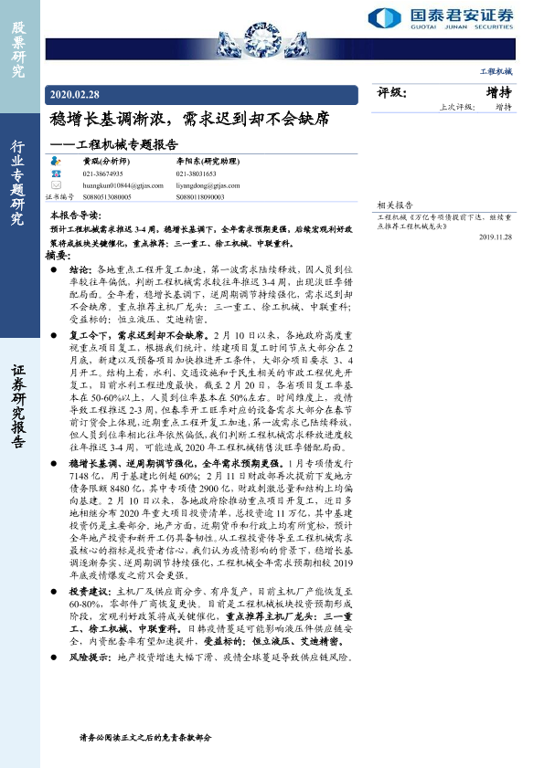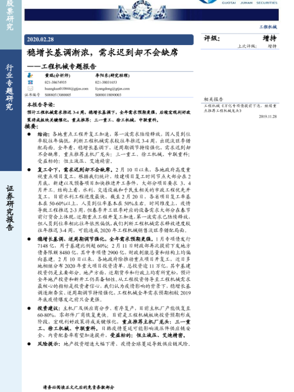 【国泰君安证券】【20200228】稳增长基调渐浓,需求迟到却不会缺席——工程机械专题报告-17页