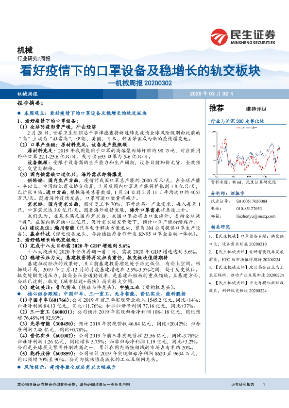 【民生证券】【20200302】20200302-民生证券-机械周报:看好疫情下的口罩设备及稳增长的轨交板块-17页