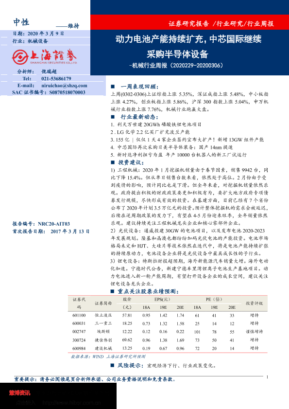 【上海证券】【20200309】机械行业周报:动力电池产能持续扩充,中芯国际继续采购半导体设备-6页