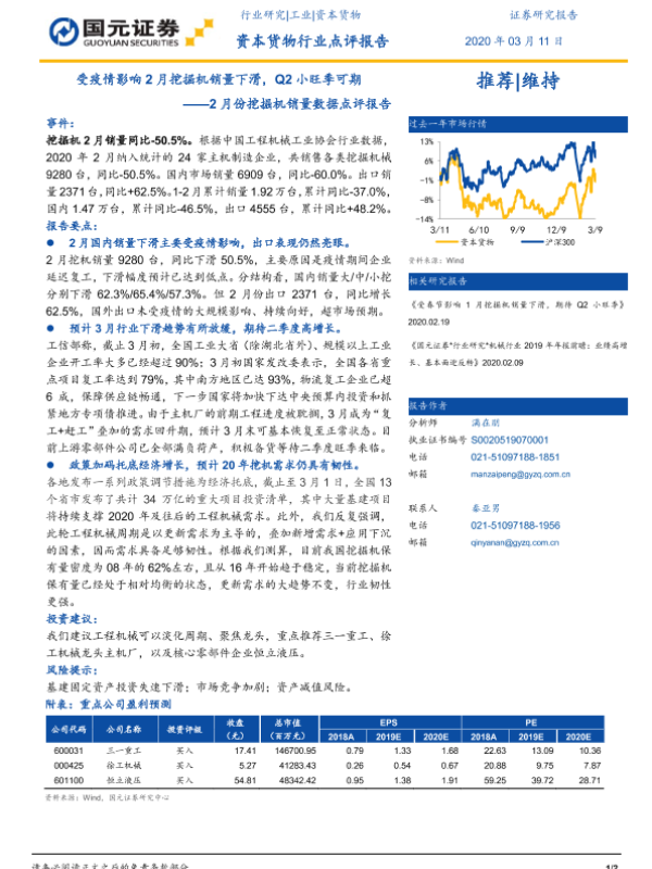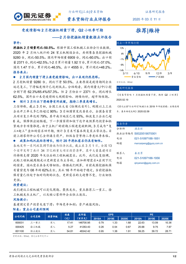 【国元证券】【20200311】2月份挖掘机销量数据点评报告:受疫情影响2月挖掘机销量下滑,Q2小旺季可期-2页