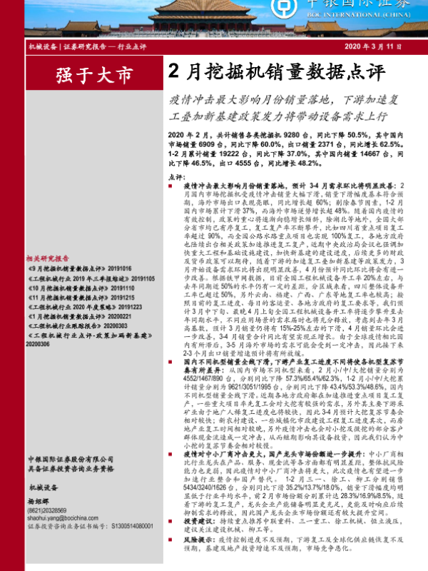 【中银证券】【20200311】2月挖掘机销量数据点评:疫情冲击最大影响月份销量落地,下游加速复工叠加新基建政策发力将带动设备需求上行-5页